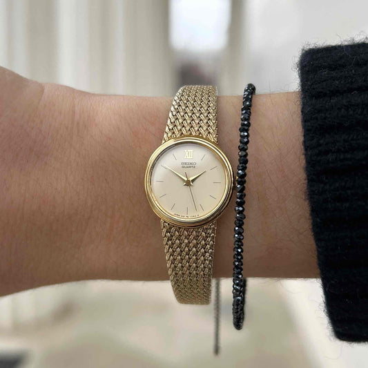 Seiko Cocktail Watch: Ladies Vintage 90s Ivory Dial Woven Bracelet